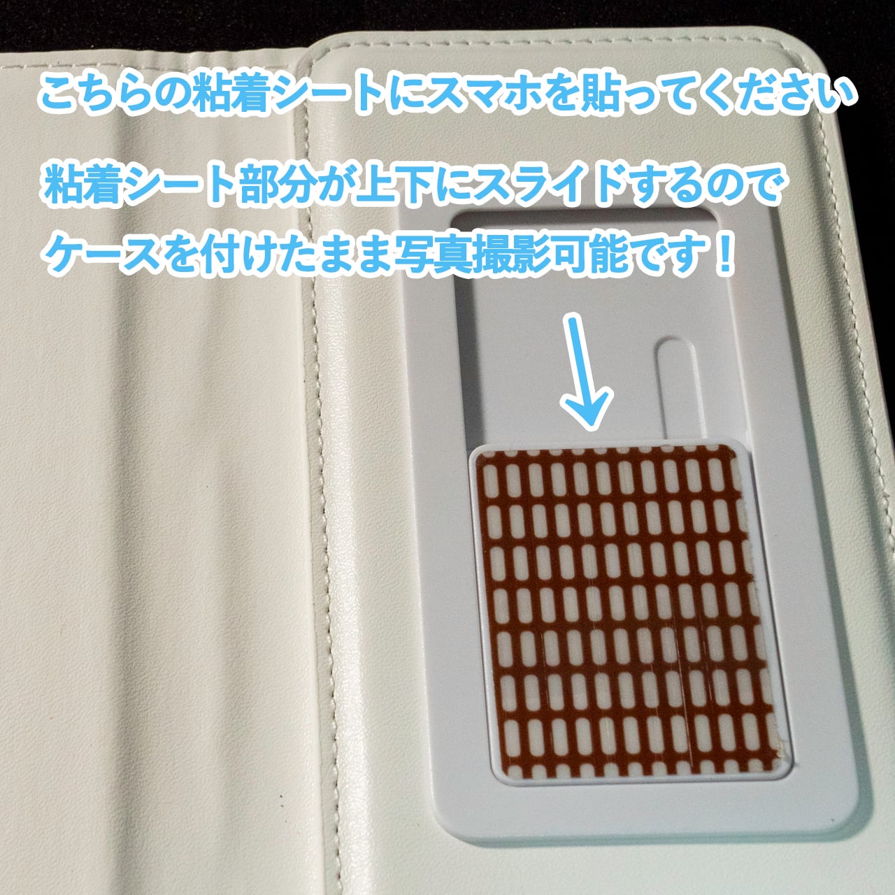 マルチスライダー(粘着シート部分)が上下にスライドするのでケースを付けたまま写真撮影可能!